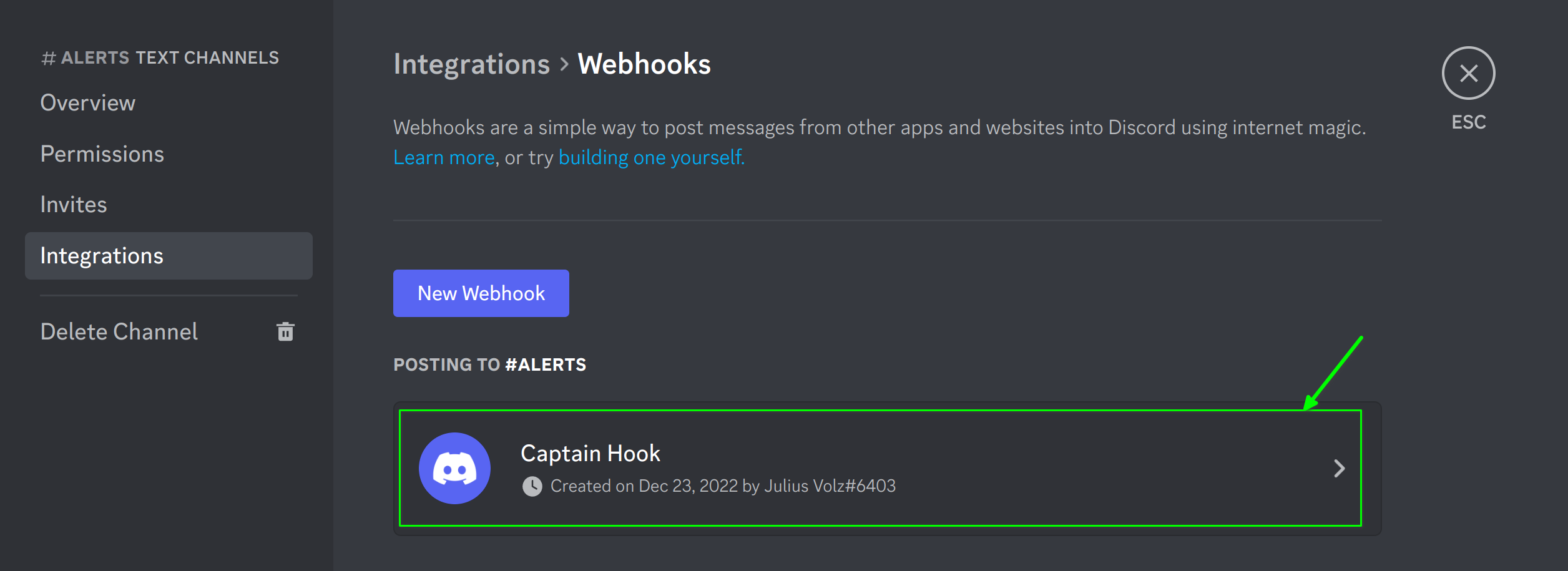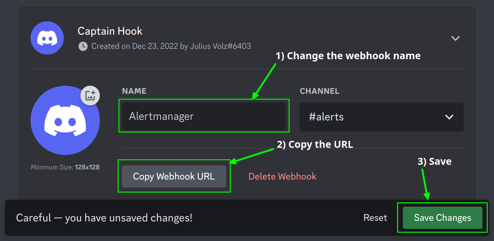 - webhook_url: <DISCORD_WEBHOOK_URL>ATTENTION: You'll need to replace the <DISCORD_WEBHOOK_URL> placeholder with the webhook URL you just copied from Discord. It should look something like this: https://discord.com/api/webhooks/XXX/YYY.
